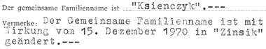 Wiederum nicht nachvollziehbar ist die erneute amtliche Namensänderung die diesmal nur die "neuen" Kinder betrifft. Diese heißen nunmehr KSIENCZYK. Die neue Verwirrung hieß also: Die Kinder einer Familie hatten verschiedene amtliche Nachnamen!